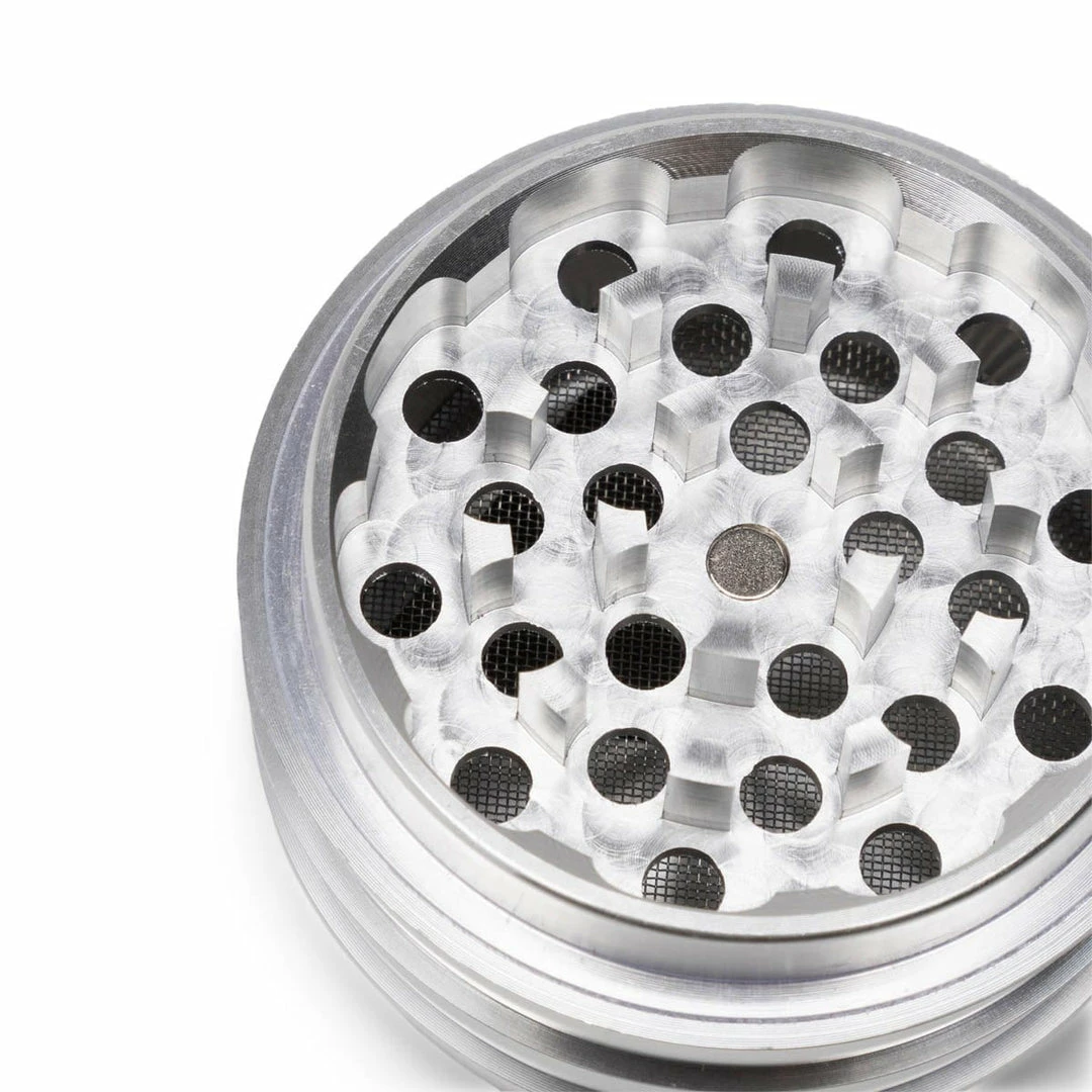 4 piece grinder made in the style of Frank Lloyd Wright’s Guggenheim Museum. Engraved with the Mister Green “Peace Logo” on the top.