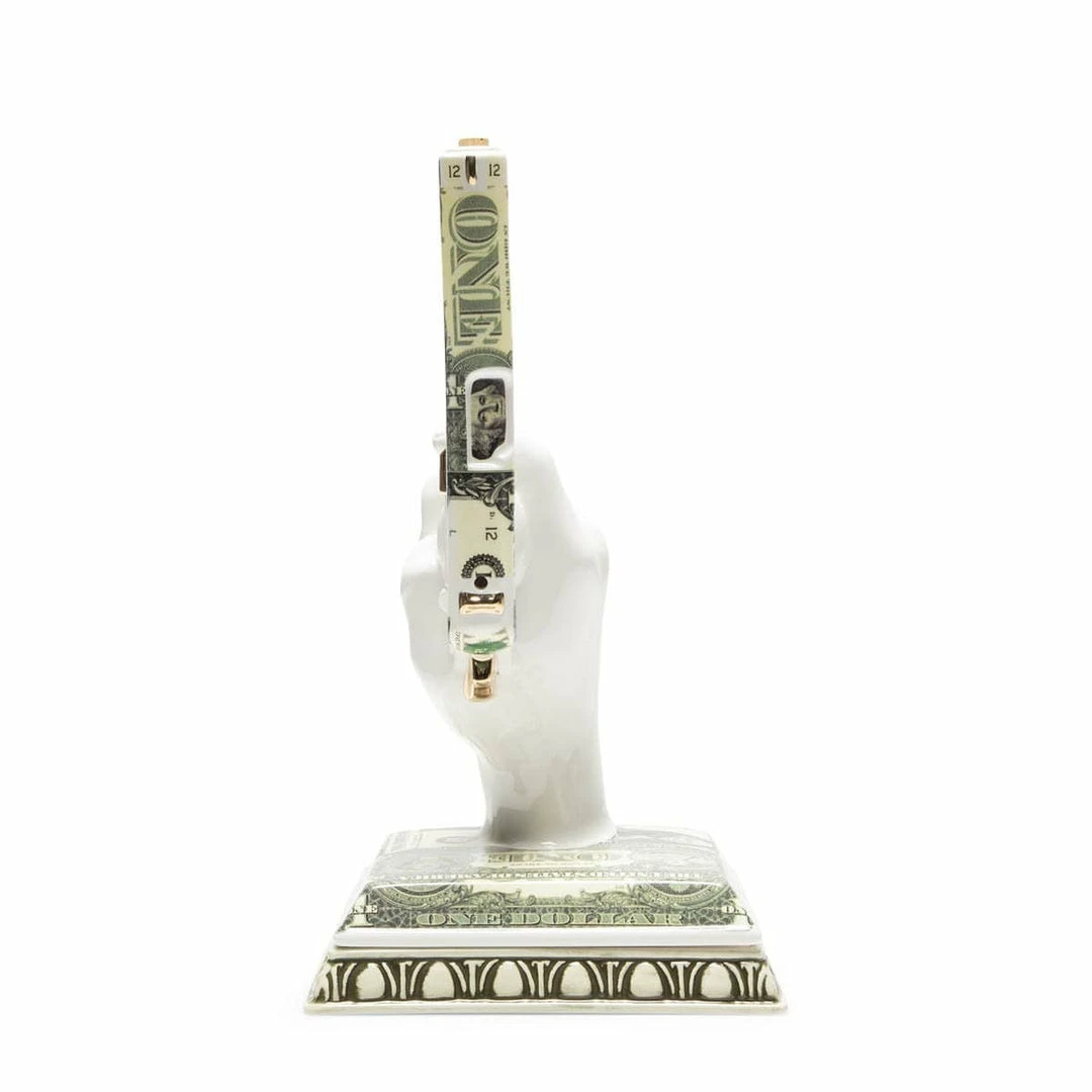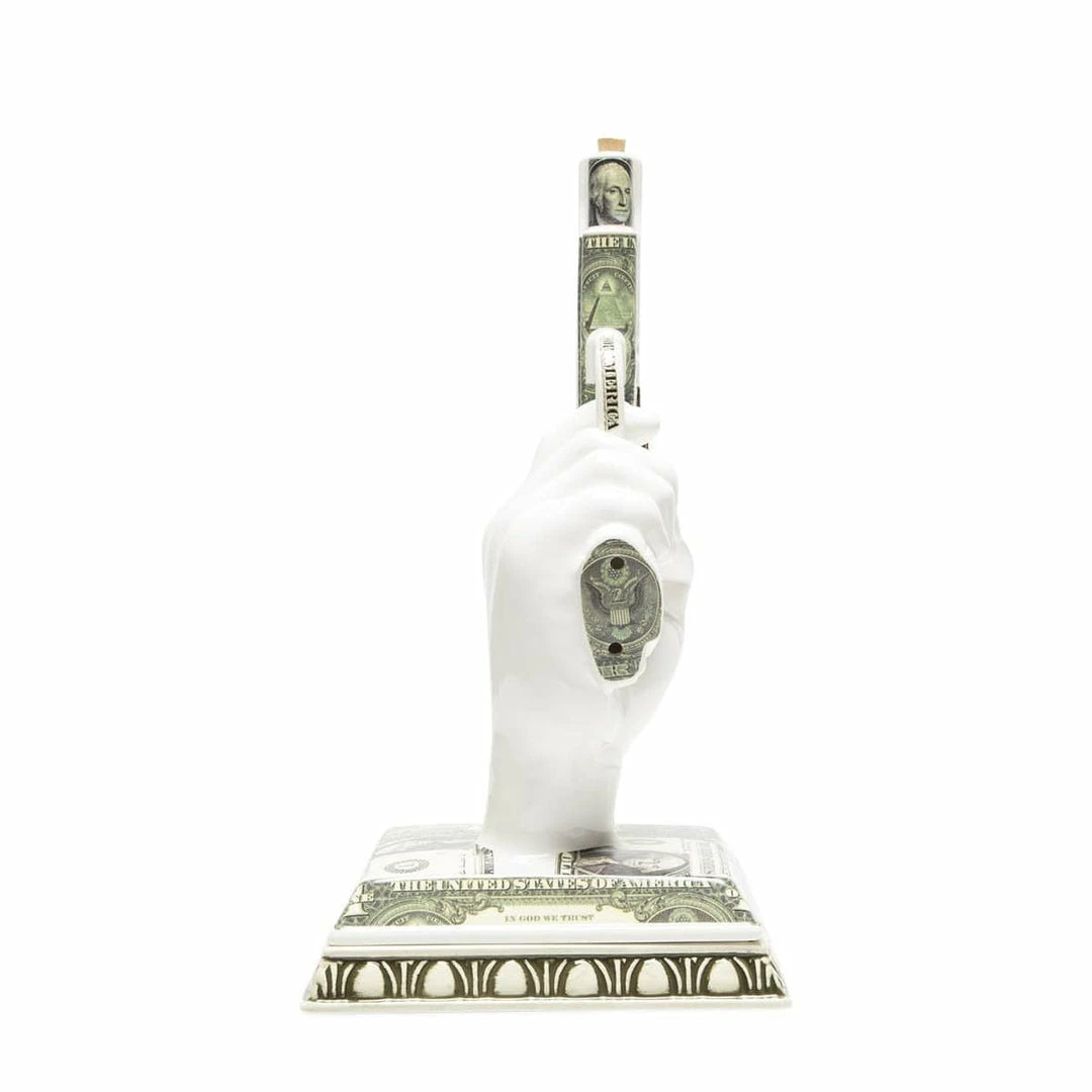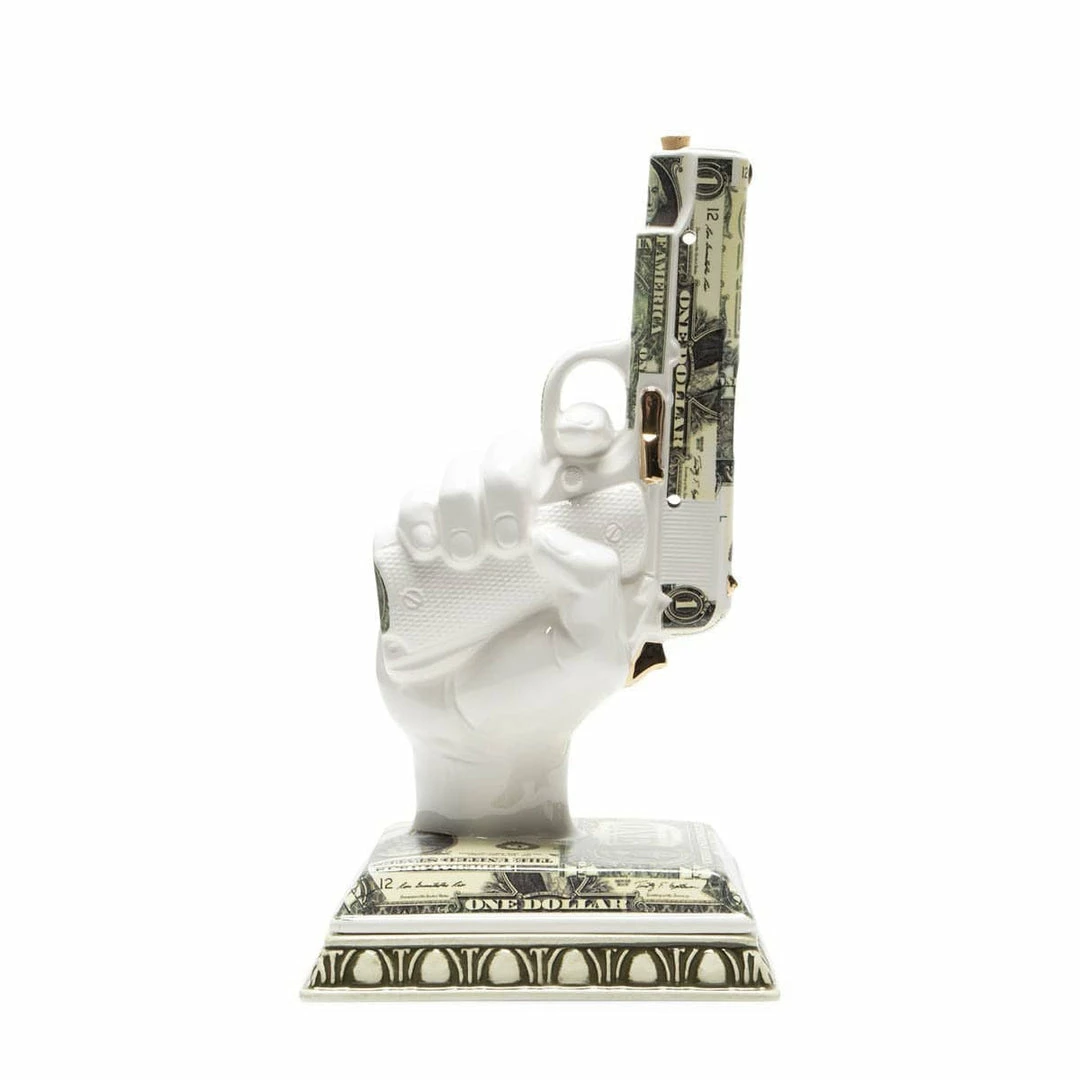 Incense chamber in the shape of a gripped pistol featuring a scanned one dollar bill at the base. 24K gold plated slide stop, rear sight, and hammer. Made for PACIFIC . SHORT / INCENSE