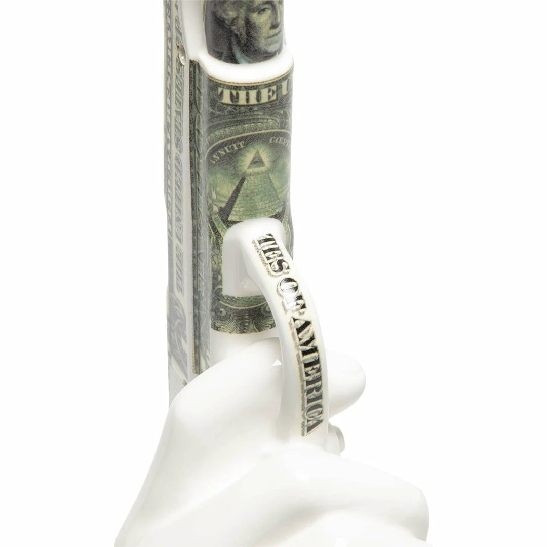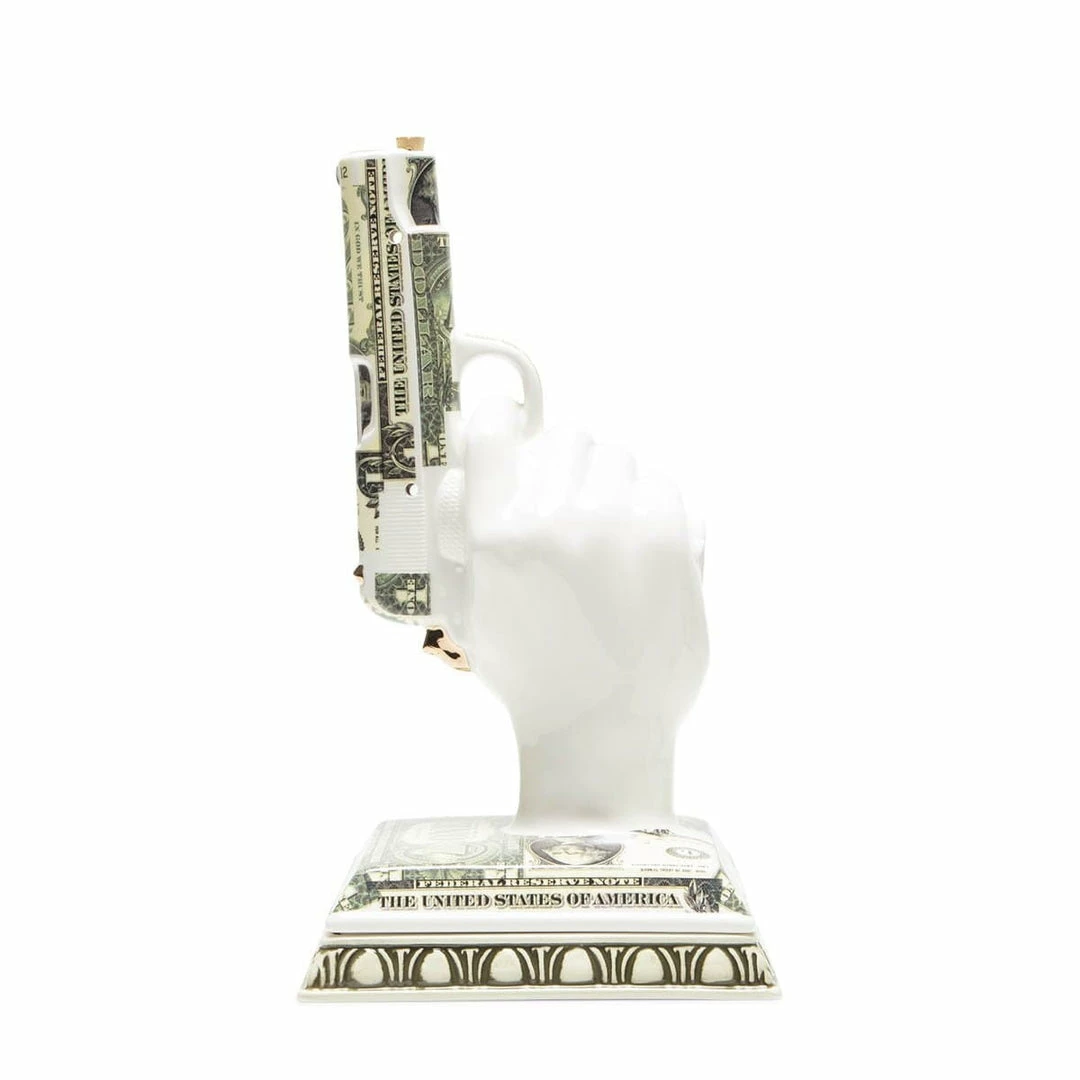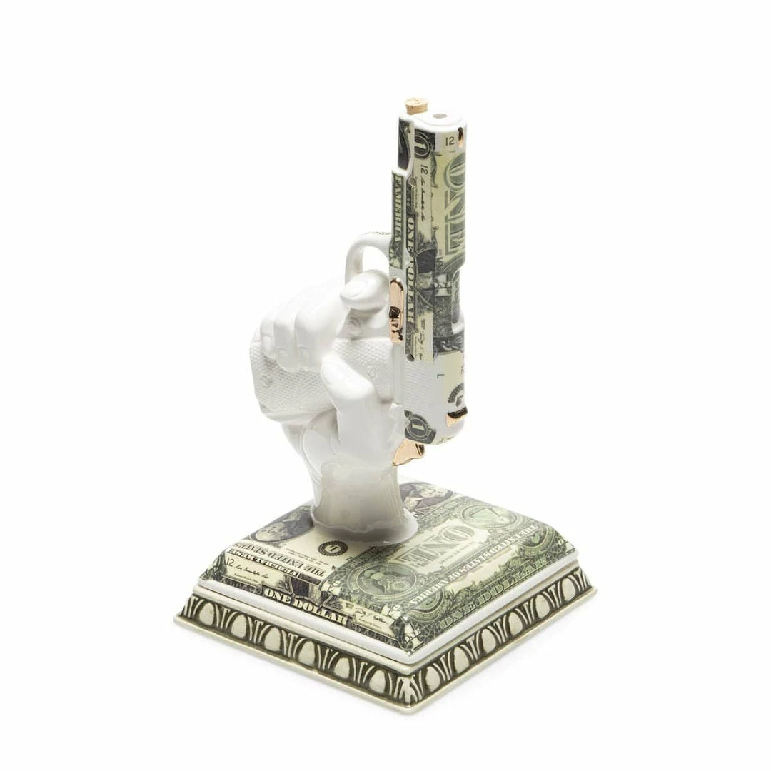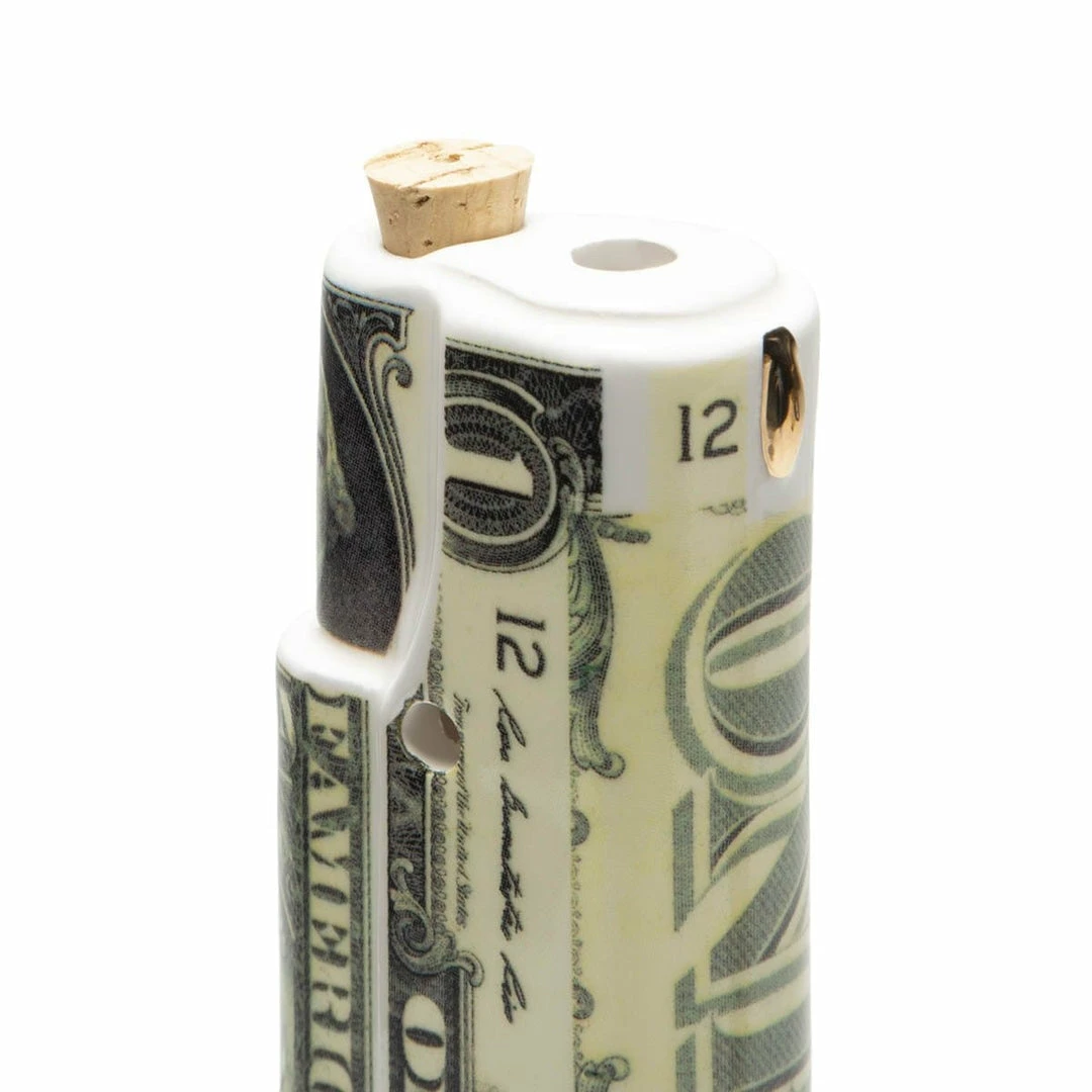 Incense chamber in the shape of a gripped pistol featuring a scanned one dollar bill at the base. 24K gold plated slide stop, rear sight, and hammer. Made for PACIFIC . SHORT / INCENSE