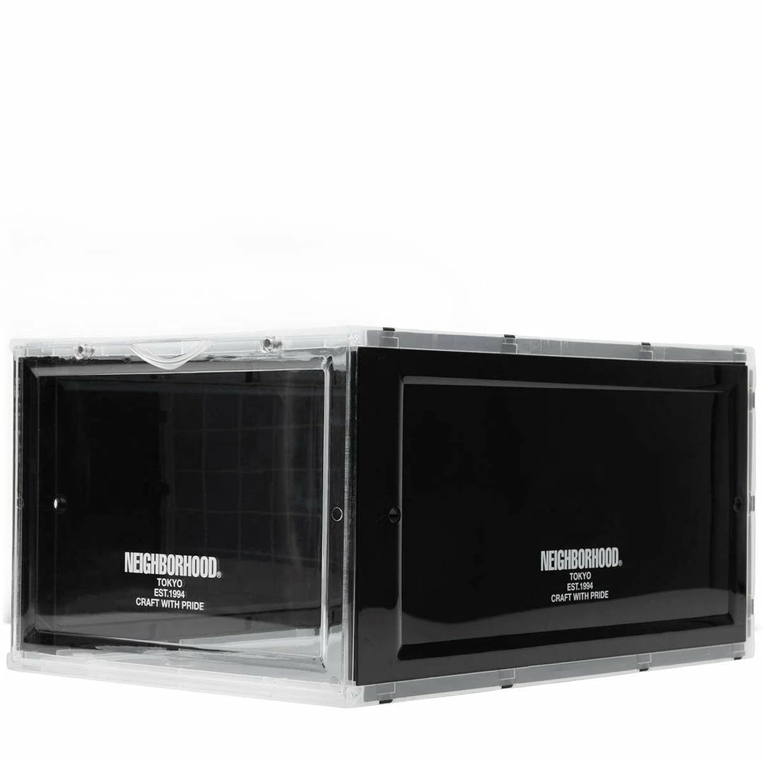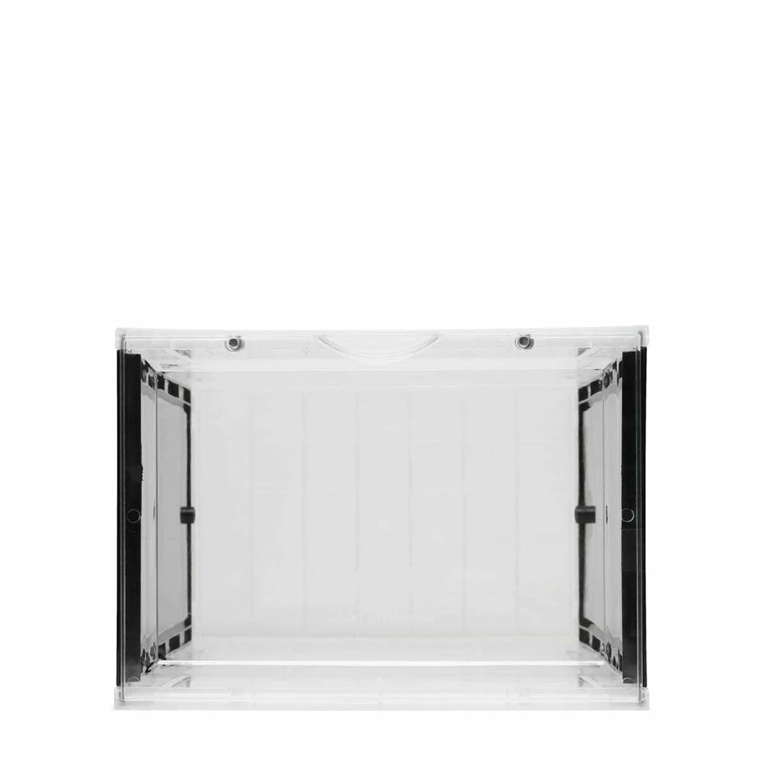 Stackable sneaker box that opens vertically. Top and sides are clear with printed logo. Large enough to fit high top sneakers and can also be used as a home decor item.ย